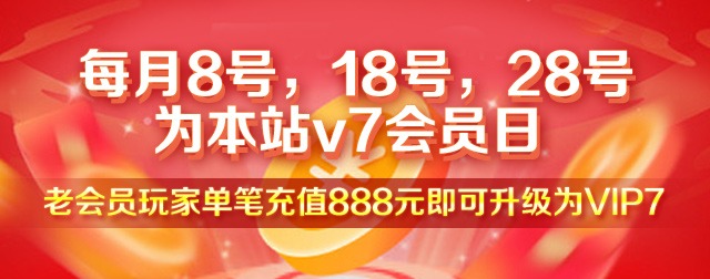 新老会员玩家单笔充值888元即可升级为VIP7根据上月充值量可在本月会员日领取福利,新会员下个月才可以领取